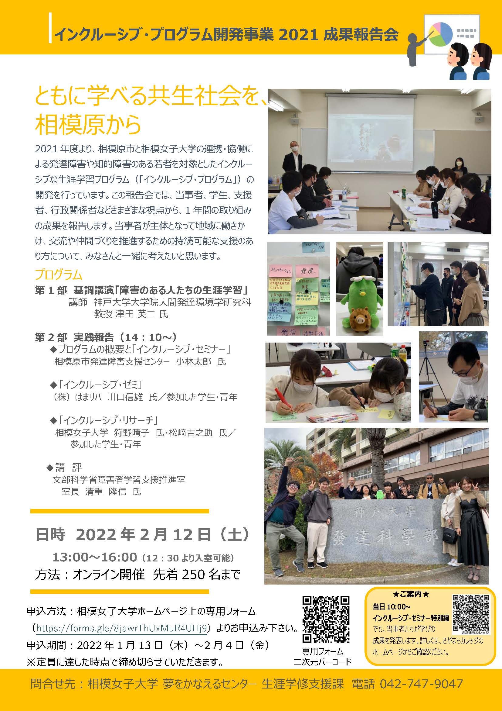 本学では、2021年度より相模原市との連携・協働により発達障害や知的障害のある若者を対象としたインクルーシブな生涯学習プログラム(「インクルーシブ・プログラム」)の開発を行っています。2月12日(土曜日)に開催された成果報告会「ともに学べる共生社会を、相模原から」では、当事者、学生、支援者、行政関係者などさまざまな視点から、1年間の取り組みの成果を報告し、当事者が主体となって地域に働きかけ、交流や仲間づくりを推進するための持続可能な支援のあり方について活発な意見交換がなされました。
