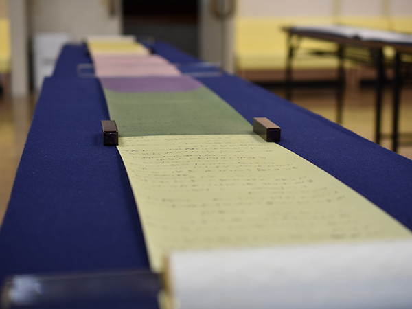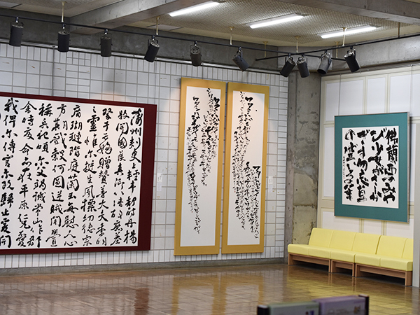 原寸(拡大)臨書2点、創作(漢字仮名交じりの書)1点、共同制作の4点を基本とし、8尺×12尺の大作から半紙サイズの小品、美しい料紙に書いた作品など、計24点を出品しました。
