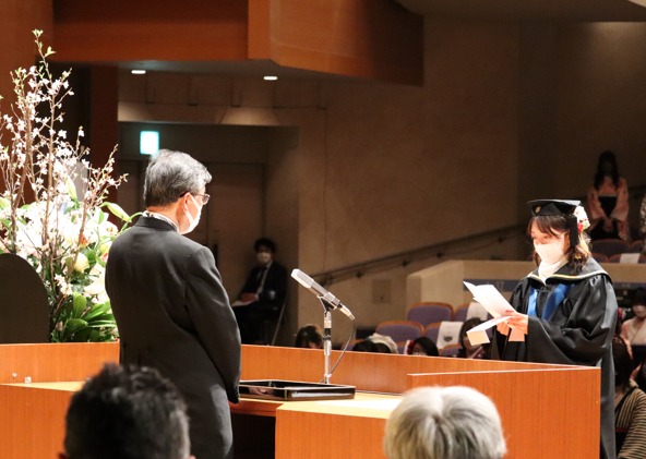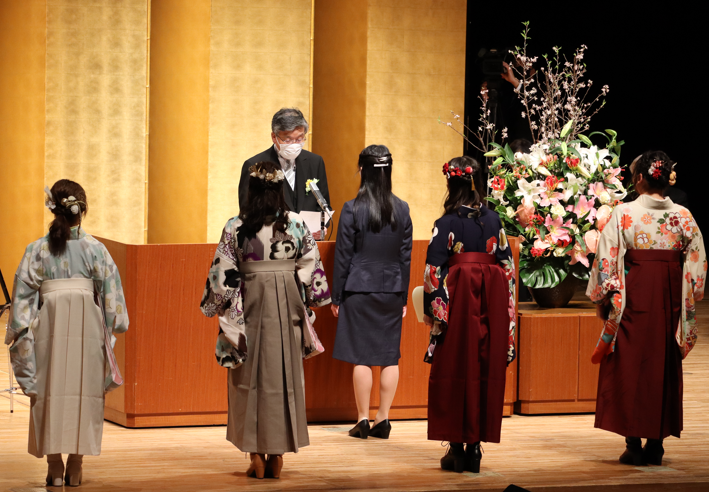 式典は、コロナ禍のため、卒業生と教職員のみの参加とし、例年よりも短いプログラムで進行されました。各学科の総代に卒業証書・学位記が授与されたのち、田畑雅英学長より「卒業生におくることば」が述べられました。また、風間誠史理事長、田中百子同窓会(翠葉会)会長より「お祝いのことば」が式次第に添えられました。