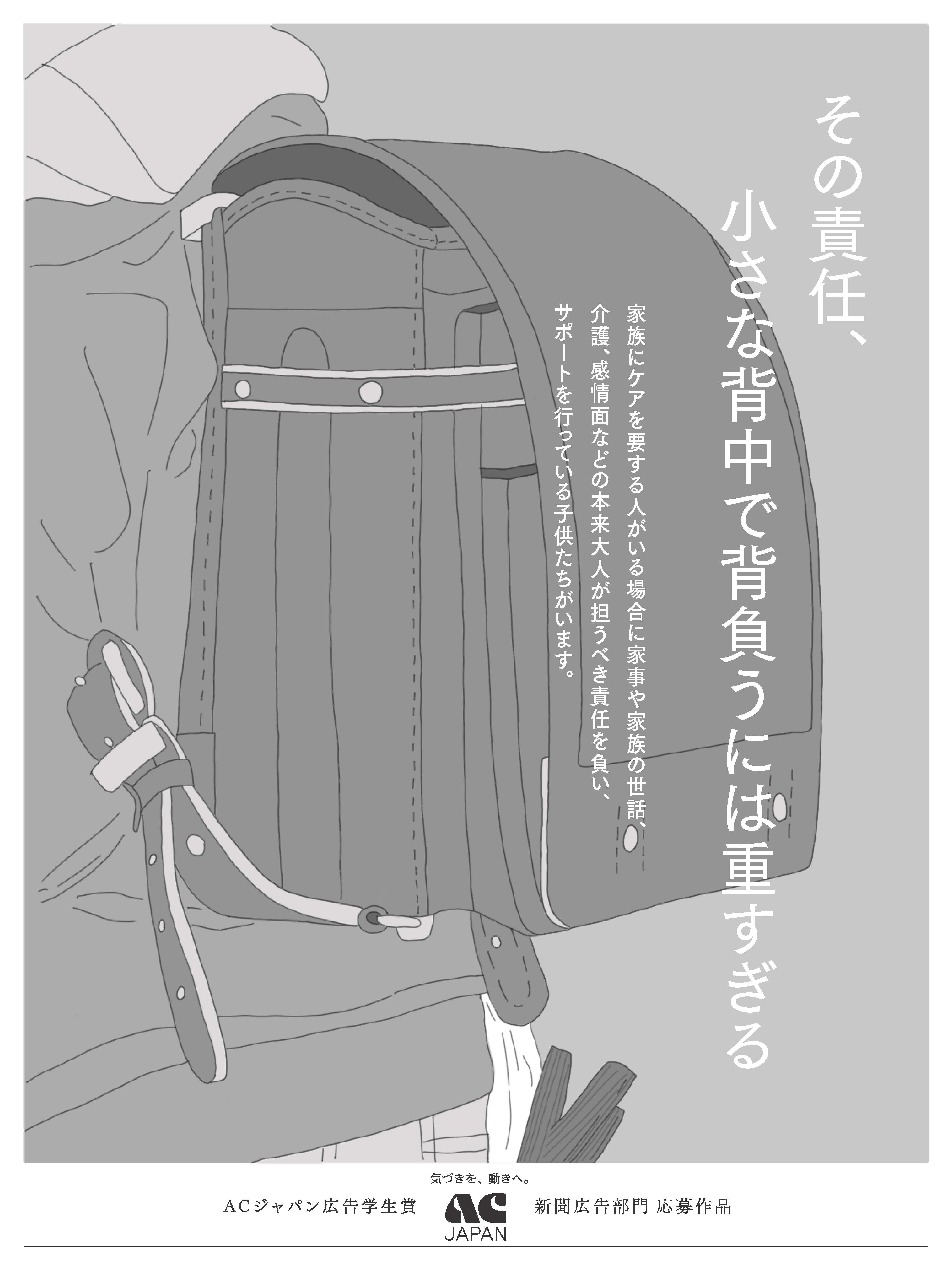 この「ACジャパン広告学生賞」は、若い世代が広告制作を通して公共広告への理解を深め、「公」への意識を育むことを目的に2005年に設立されました。学生ならではの視点や発想が選考のポイントとなっているもので、齋藤さんの作品『子供が負うには重すぎる責任』は「ヤングケアラー」をテーマにした作品です。