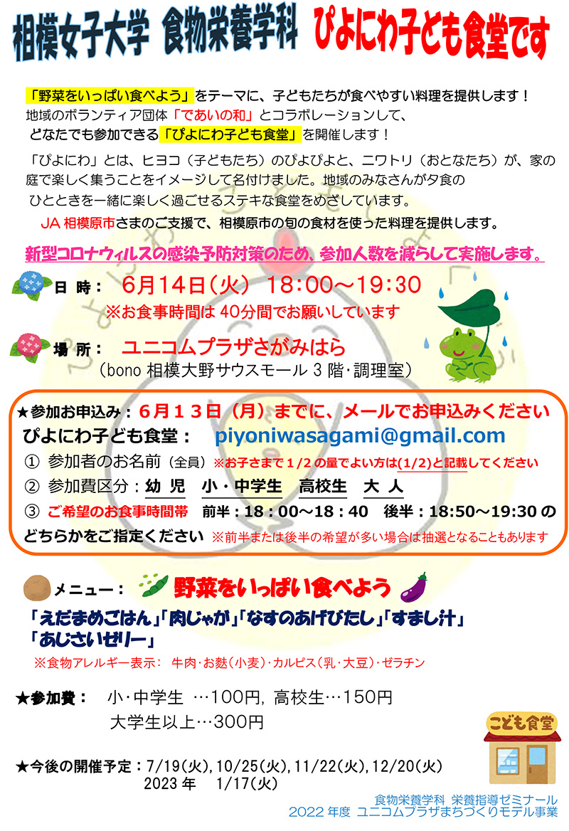 【短期大学部 食物栄養学科】2022年度 第2回「ぴよにわ子ども食堂」を開催します[6月14日・火曜日]