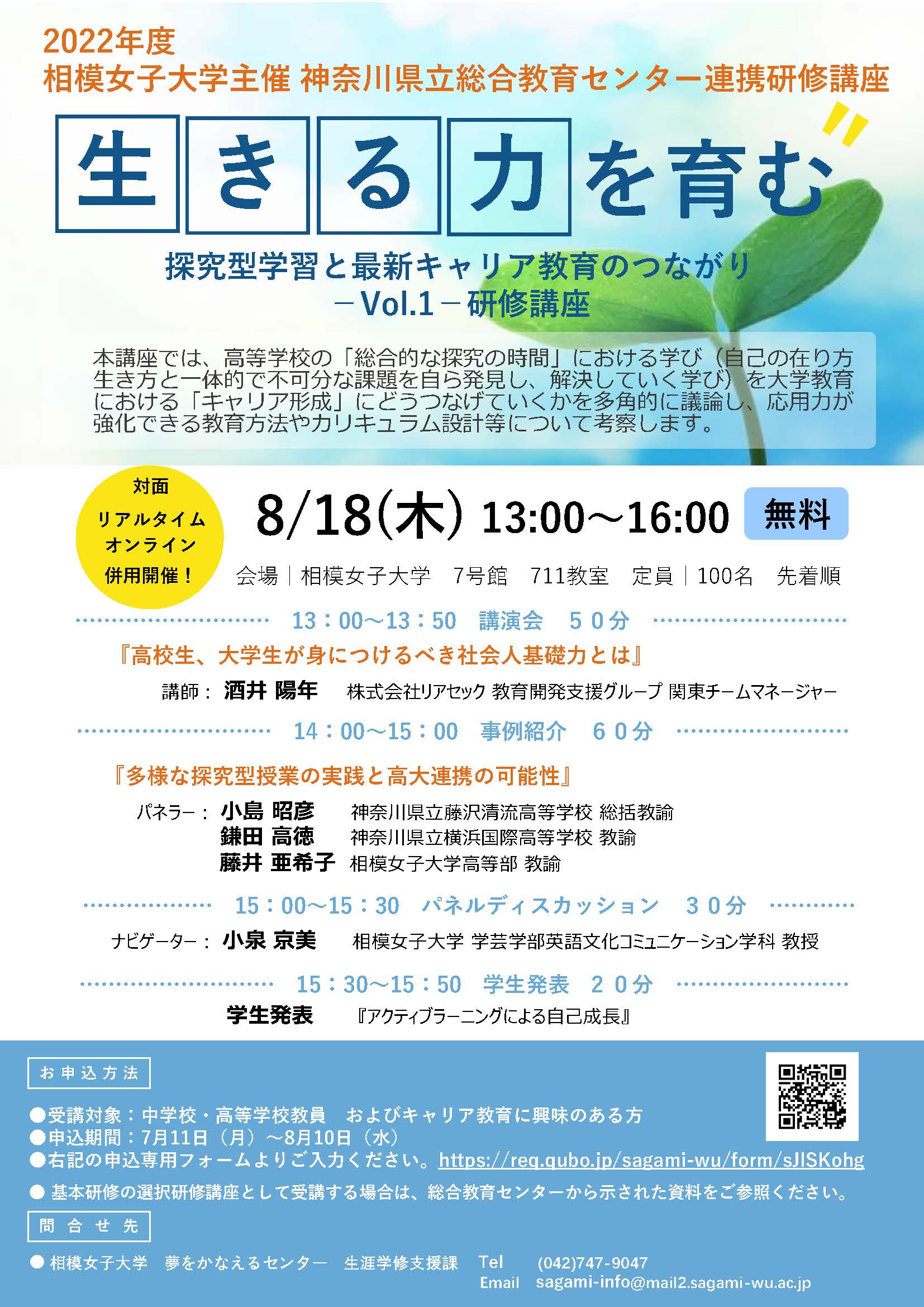| 申込方法 | 下記の申込専用フォームよりお申込みください。 https://req.qubo.jp/sagami-wu/form/sJlSKohg *基本研修の選択研修講座として受講する場合は、総合教育センターから示された資料をご参照ください。 |