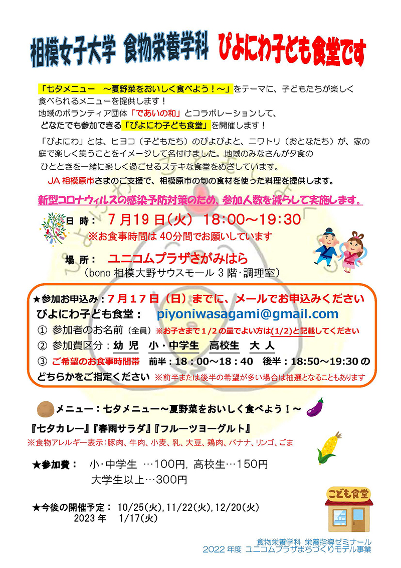 【短期大学部 食物栄養学科】2022年度 第3回「ぴよにわ子ども食堂」を開催します[7月19日・火曜日]