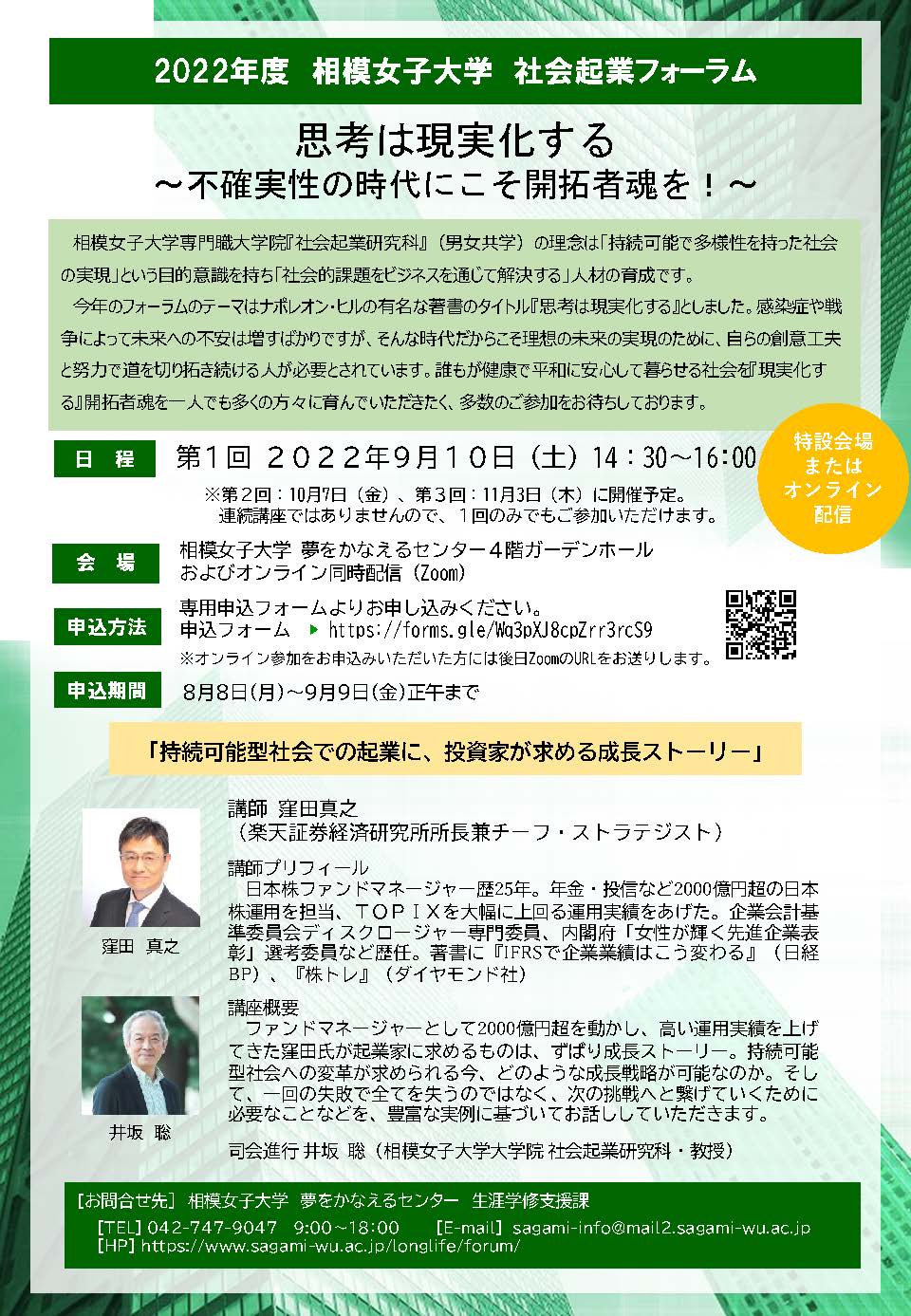 【社会起業研究科】2022年度 社会起業フォーラム 第1回『持続可能型社会での起業に、投資家が求める成長ストーリー』開催のお知らせ[9月10日・土曜日]