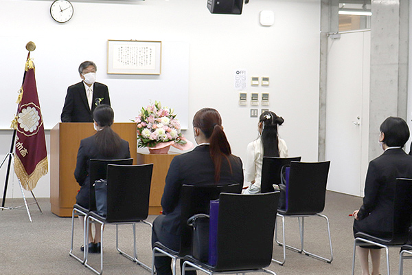 新型コロナウイルス感染症感染拡大防止のため、規模を縮小しての実施となりましたが、田畑学長より卒業証書の授与と「卒業生におくることば」が述べられ、温かみのある卒業式となりました。式典後には、教員より卒業生に花束が贈られました。
