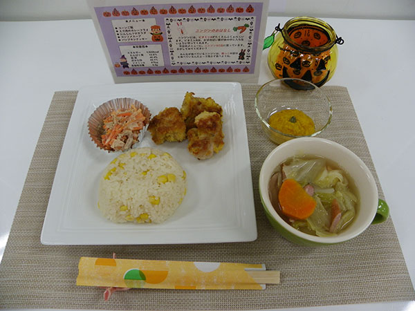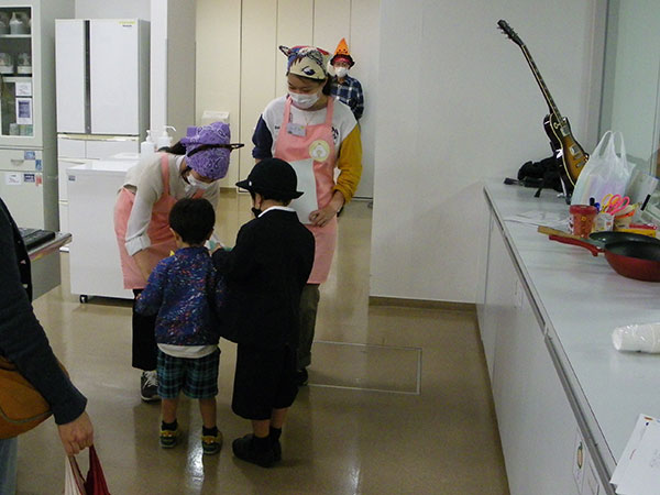 今回は『今年のハロウィンはぴよにわ子ども食堂で!』をテーマに、洋風メニューを学生が考えました。子どもたちに人気だったのは、JA相模原市様が配送してくださった相模原市産の甘いニンジンがたっぷり入った『コンソメスープ』や『にんじんツナサラダ』でした。バターが香る『コーンご飯』、エスニックな味が自慢の『とり肉のカレーフライ』は、「食べやすい料理で、子どもが残さず食べてくれました」とお母さんから嬉しい声をいただきました。『ハロウィンかぼちゃクッキー』は柔らかく仕上がってしまいましたが、ハロウィンらしいメニューが提供できました。また、学生達はネコのカチューシャをつけて仮装し、子どもたちにお菓子をプレゼントしました。「ネコからお菓子をもらった!」と喜ぶ子どもたちの笑顔はとても嬉しそうでした。