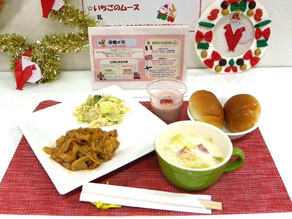 今回は『おなかもココロもあったまるクリスマスメニュー!』として、学生たちは子どもが食べやすい味のメニューを考えました。JA相模原市様に配送いただいた、相模原市産の新鮮キャベツがザクザク入った「ミルクスープ」、よく炒めた玉ねぎが甘く食べやすいと評判だった「ポークケチャップ」、マヨネーズたっぷりの「マカロニツナサラダ」、しっかり固まらず「イチゴミルク」のような甘酸っぱい「いちごのムース」を提供しました。