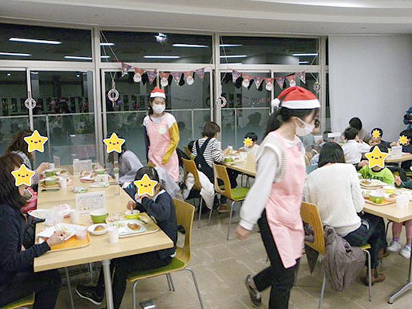 クリスマス近くの12月23日(金)に、短期大学部食物栄養学科の栄養指導ゼミナールの学生が、本年度第6回「ぴよにわ子ども食堂」を開催しました。夕食の時間帯に2回に分けて開催し、31名(子ども19名)が参加してくださいました。多くの参加希望をいただき、抽選させていただきました。今回は食物栄養学科の助手の先生にもお手伝いいただき、学生たちはとても感謝していました。また来年度の「大学案内」の撮影も行われました。