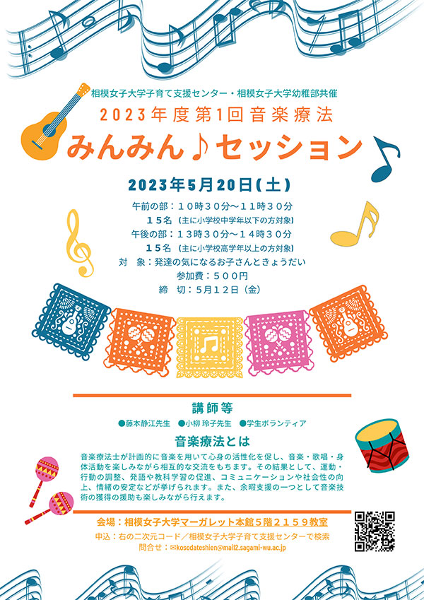 【子育て支援センター】2023年度 第1回音楽療法みんみん♪セッション 開催のお知らせ[5月20日・土曜日]