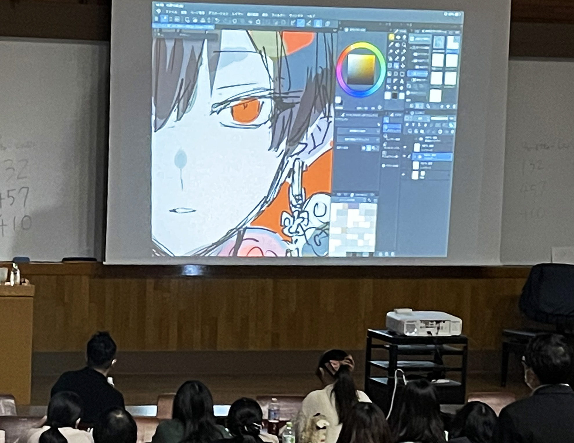 今回は第4回目として、12月4日(土曜日)にSNS絵師として活躍されている さくしゃ2氏をお招きし、「さくしゃ2氏に聞くクリエイター業界について」と題して、イラストの道に進んだ経緯や自分のイラストの価値を高めるための工夫などを講演していただきました。また講演だけでなく、ライブペイントにて作品の制作過程を見せていただきました。さくしゃ2氏のセルフブランディングの考え方や、仕事としてSNSを活用する方法など、ここだけでしか聞けないような貴重なお話を聞くことができ、学生にとっては有意義で大いに刺激になる講演でした。