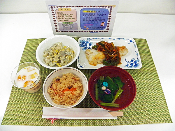 今回は『郷土料理を楽しもう!』として、栄養バランスの良い和風メニューを学生たちが考えました。兵庫県の「たこ飯」を主食として、主菜「鱈(たら)の野菜あんかけ」、副菜「れんこんの和え物」、汁物「ほうれん草のおすまし」、デザート「フルーツ寒天」を提供しました。