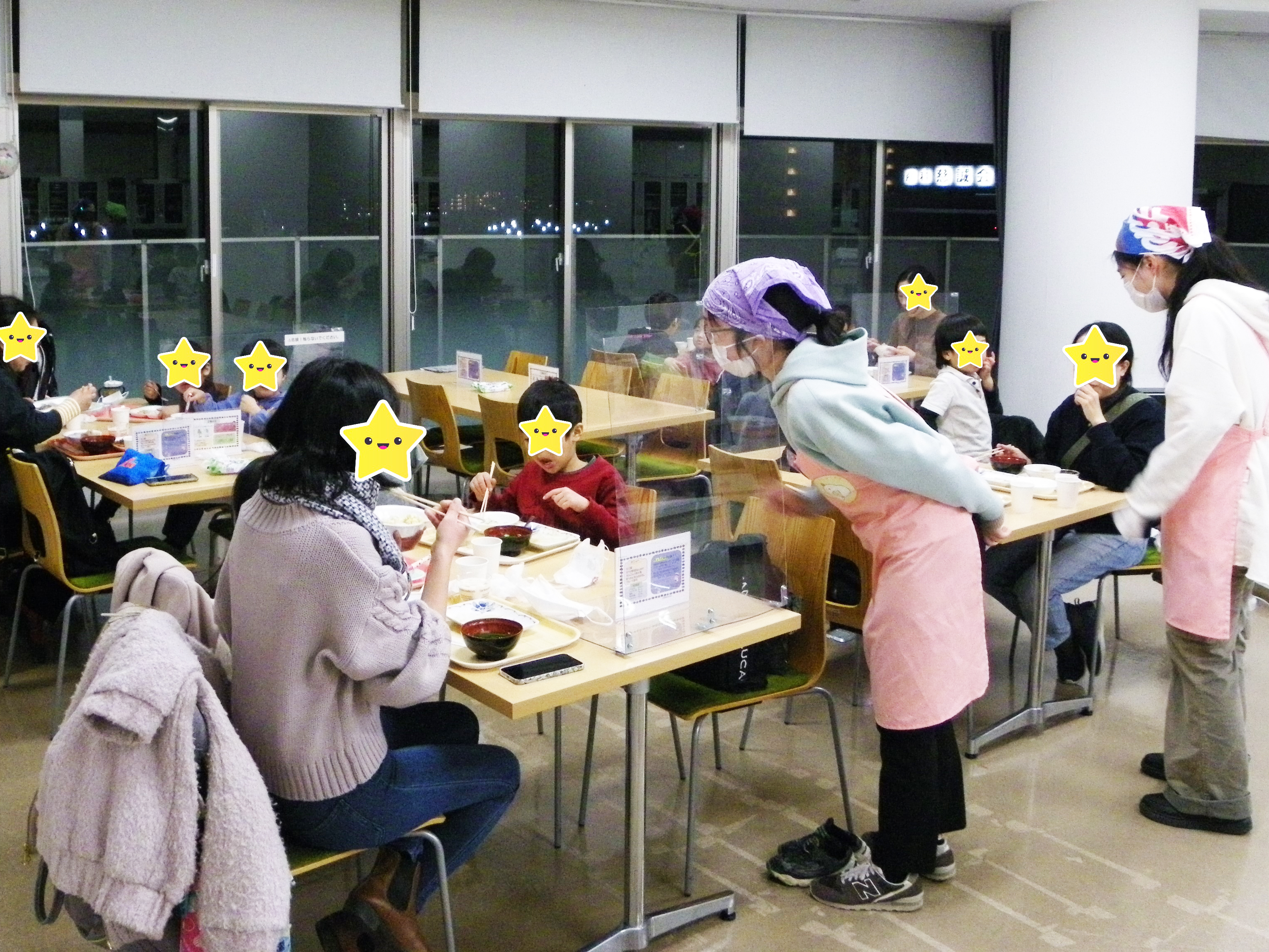 春休み期間の2月16日(木曜日)に、食物栄養学科の栄養指導ゼミナールの学生が、本年度第7回『ぴよにわ子ども食堂』を開催しました。夕食の時間帯に2回に分けて開催し、27名(子ども17名)が参加してくださいました。