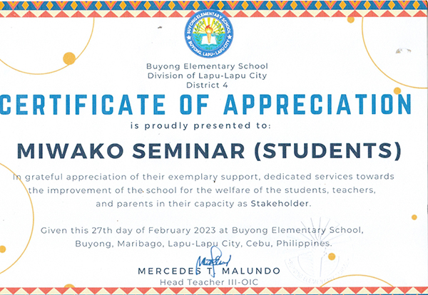 また、日本の文化を伝えるため、学生は浴衣姿を披露したり、書道の授業を行うなど、現地の児童や教職員と交流を深めることができました。最終日には、この活動に対し、ブヨン小学校より感謝状をいただくことができました。