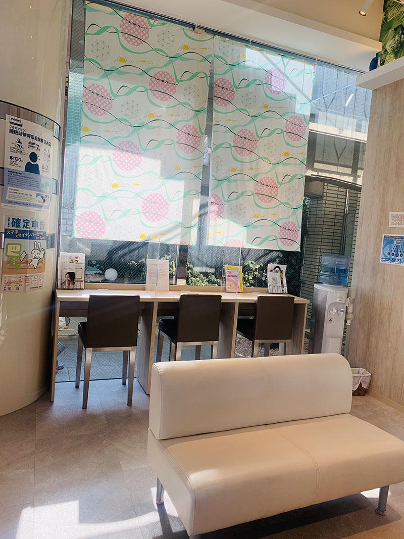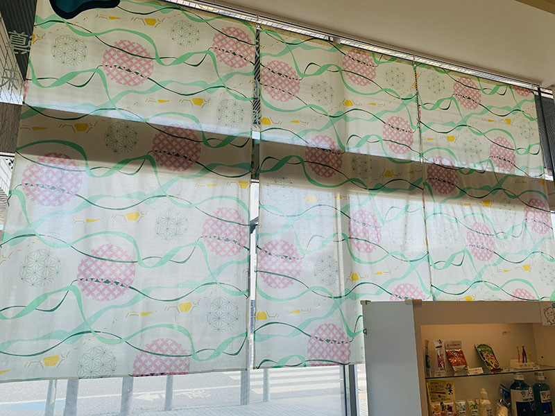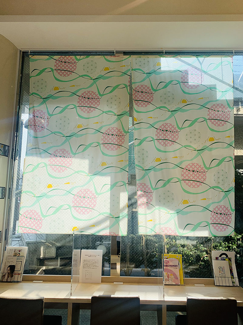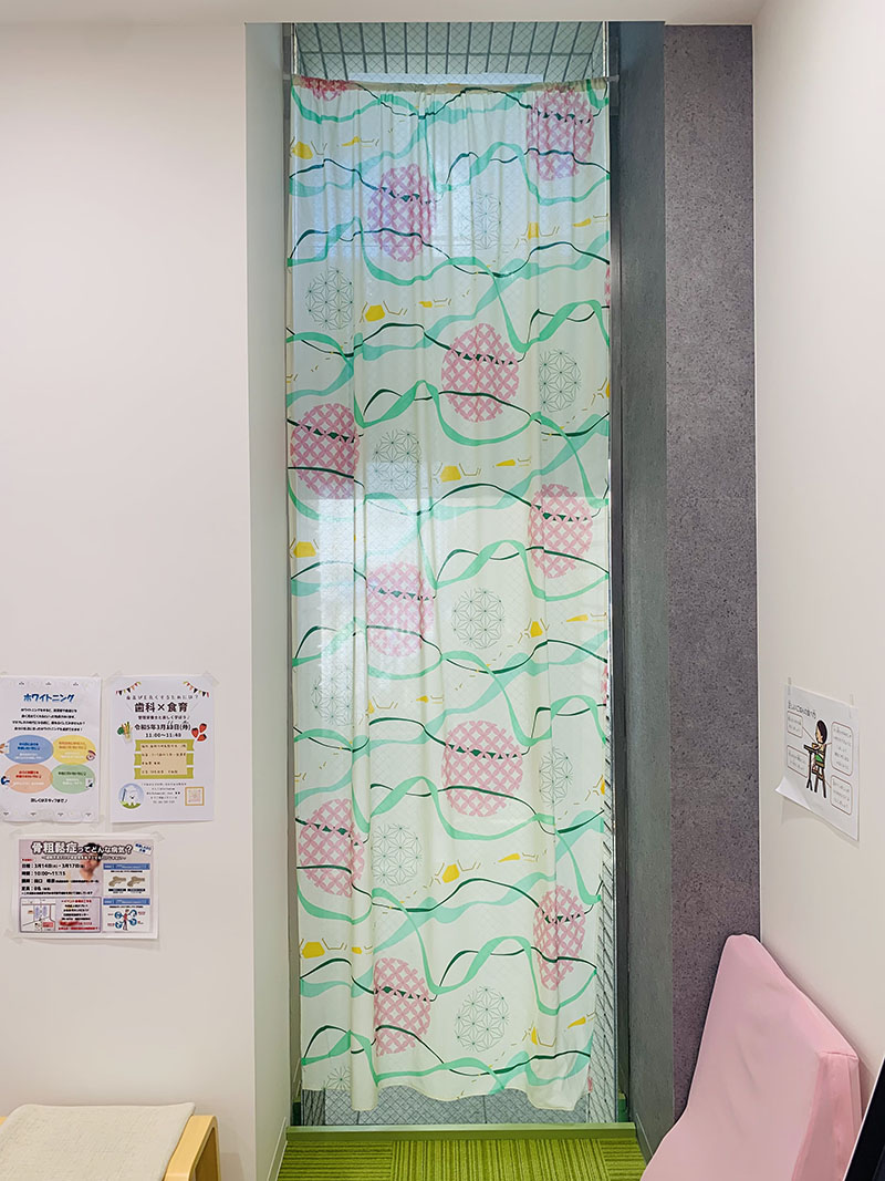 春らしい爽やかな布に、春らしい優しい色使いの柄をプリントしているので、治療に不安を持っている方もそうでない方も、このカーテンを見て少しでも心を安らげることができたらいいなと思います。