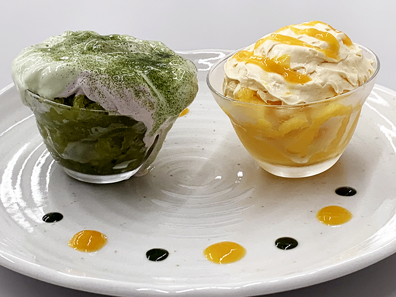 嚥下機能の低下があっても「好きなものを食べたい」という要望を実現できる、見た目や味とともに香りも楽しめる嚥下調整食デザートです。カンナで削ったような氷で雪のようにふわふわした口どけである「雪花氷」と増粘剤を組み合わせ、さらに口どけの良さや見た目の楽しさが特徴のエスプーマを加えることで、口当たりの良い美味しさで、溶け出しても誤嚥しにくい物性に仕上がりました。