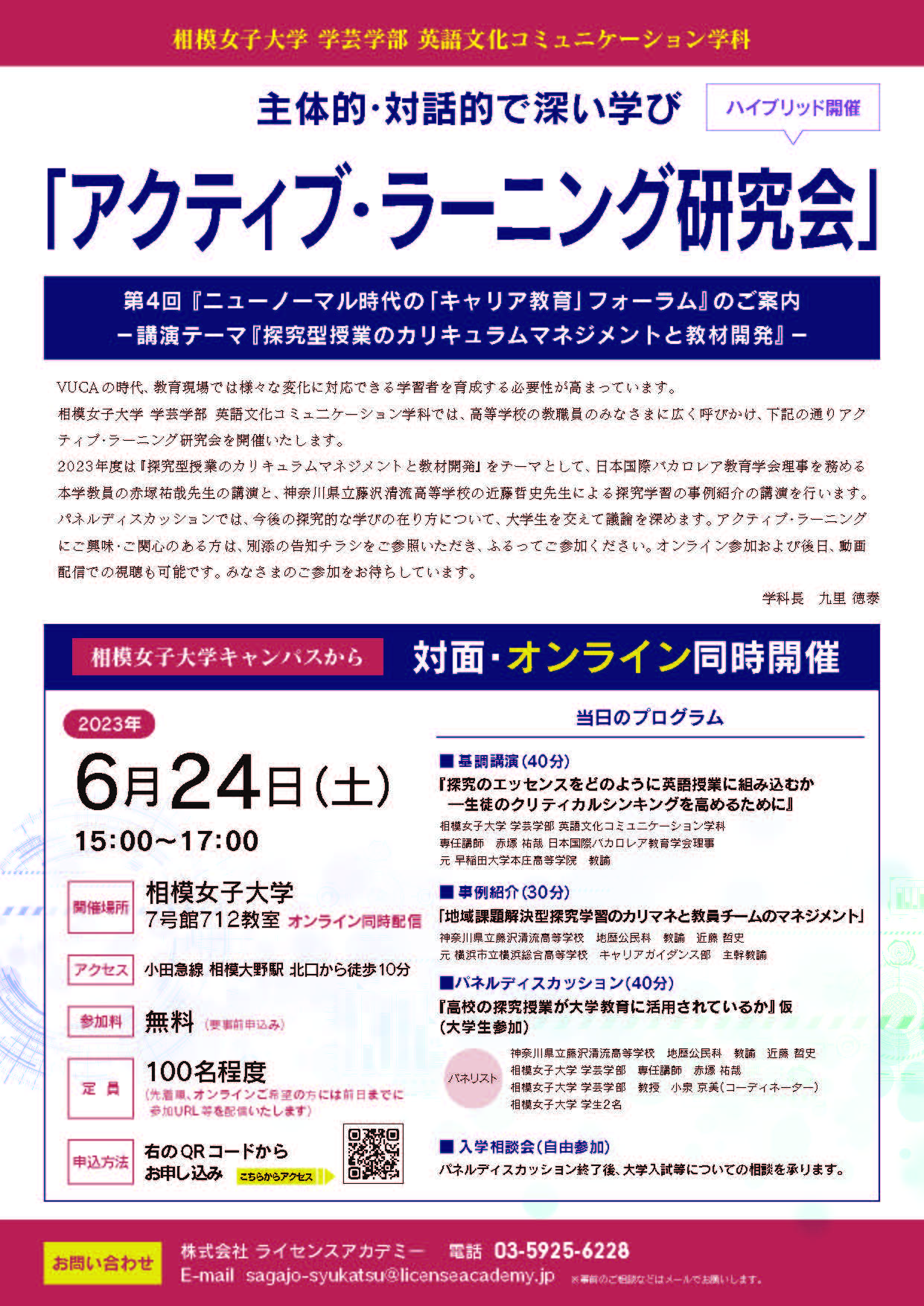 【英語文化コミュニケーション学科】第4回高大連携「アクティブ・ラーニング研究会」 『ニューノーマル時代の「キャリア教育」フォーラム』開催のお知らせ[6月24日・土曜日]