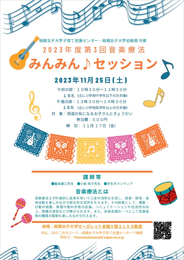 【子育て支援センター】2023年度 第3回音楽療法みんみん♪セッション 開催のお知らせ[11月25日・土曜日]