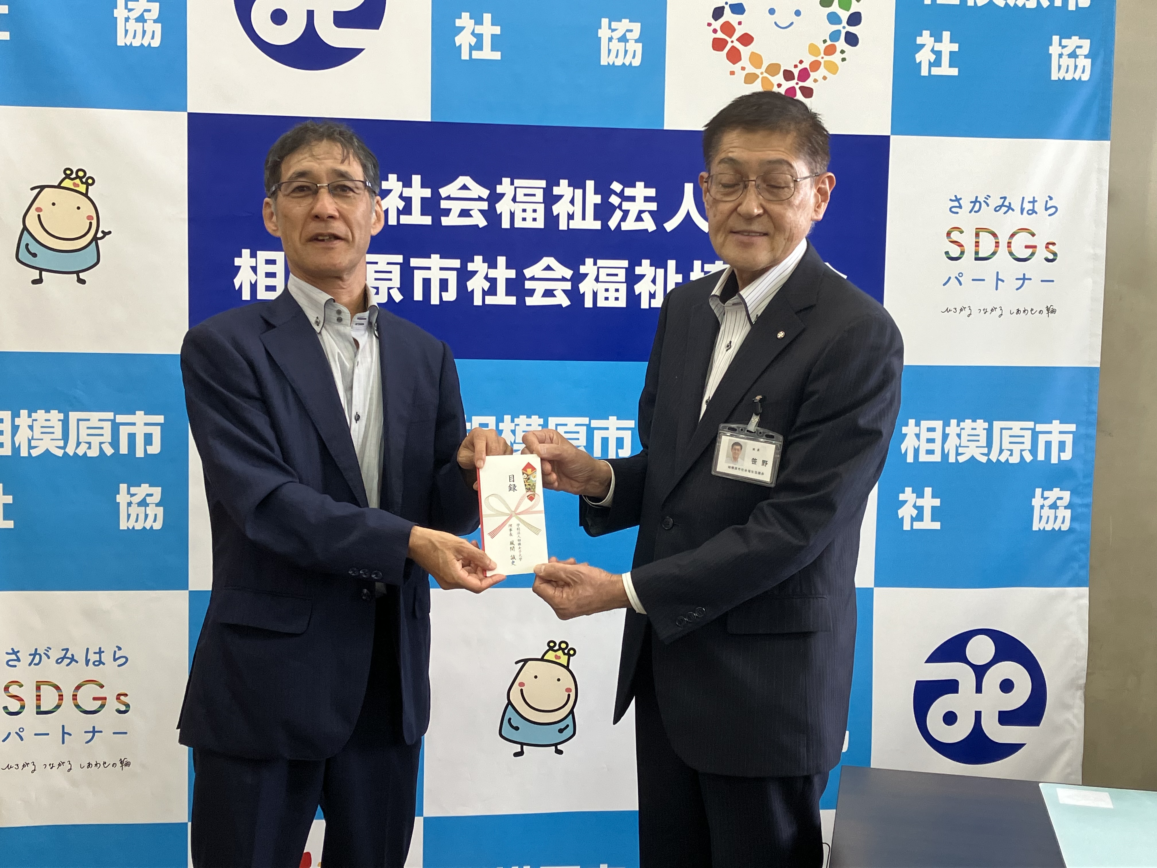 当日は相模原市立あじさい会館で、本学の風間理事長から協議会笹野会長に目録を手渡し、贈呈式を行いました。前回と同様に寄付をした食品は多くの団体に配布される予定です。