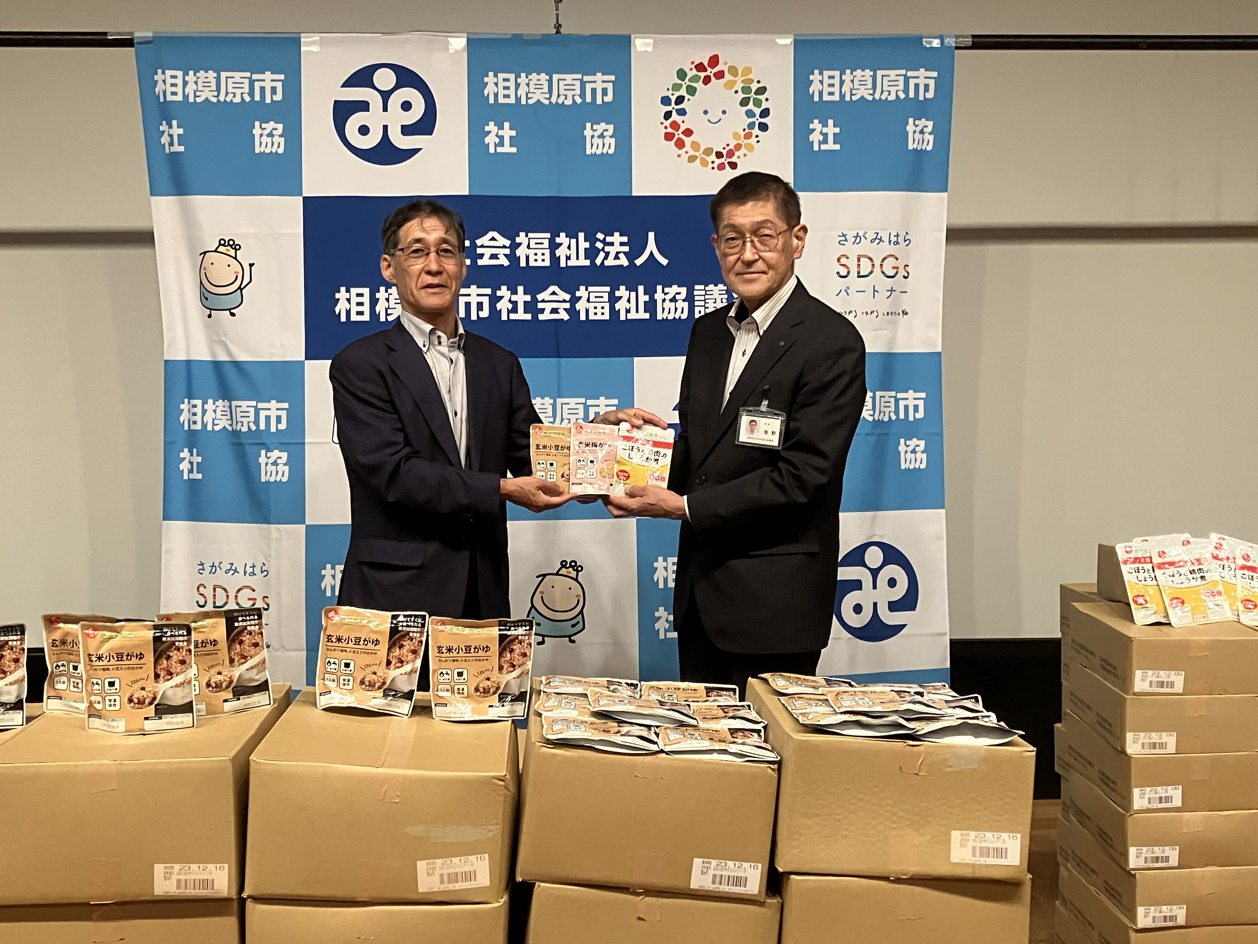 今回そのうちの一部である玄米梅がゆ、玄米小豆がゆおよびごぼうと鶏肉のしょうが煮各2,000食分を、6月に引続き、相模原市内のこども食堂など食品を必要としている団体へ食育支援等をしている社会福祉法人相模原市社会福祉協議会に寄付をしました。