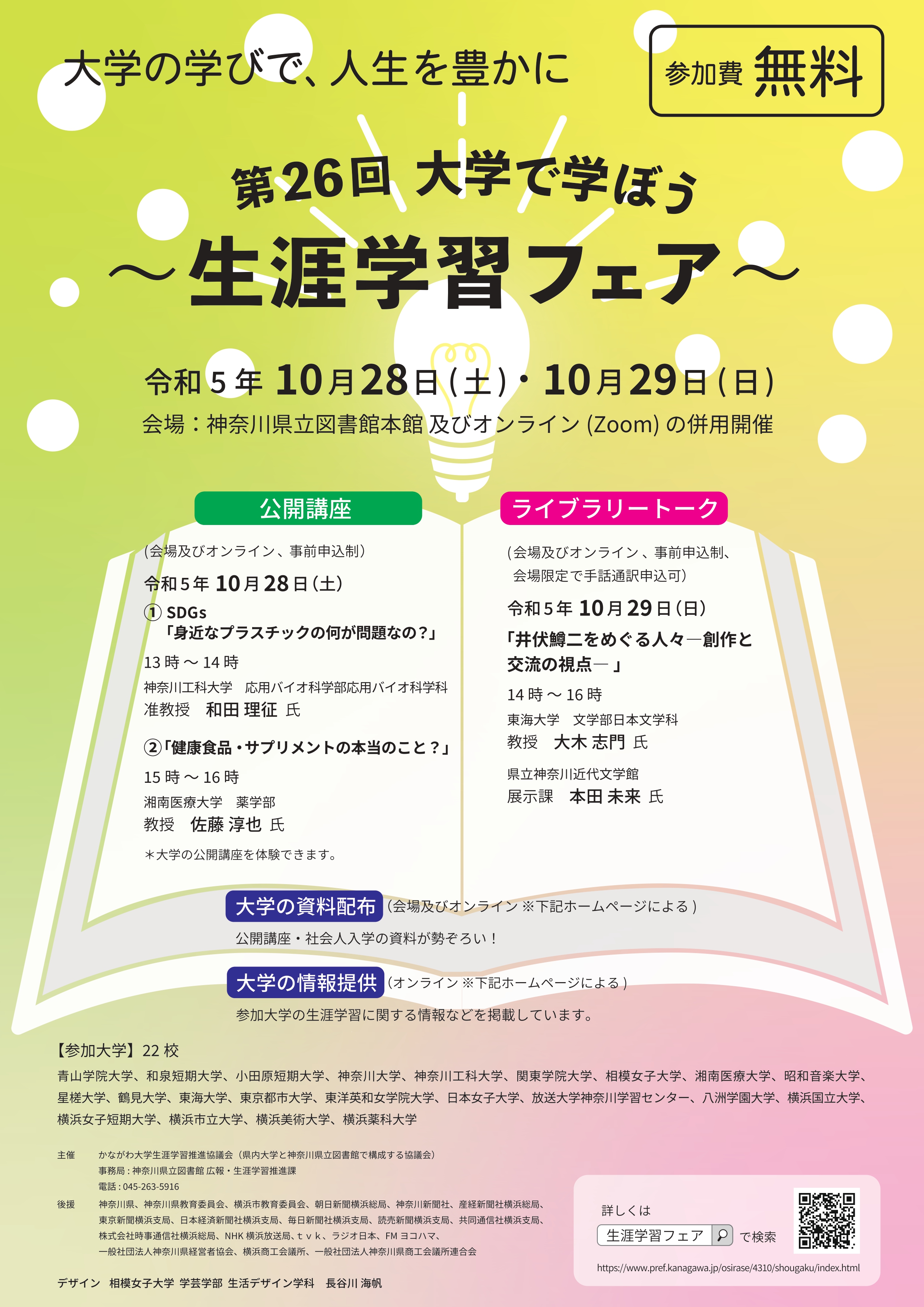 「第26回大学で学ぼう~生涯学習フェア~」は、かながわ大学生涯学習推進協議会が主催するイベントで、10月28日(土曜日)・10月29日(日曜日)に神奈川県立図書館及びオンライン(Zoom)で開催されます。