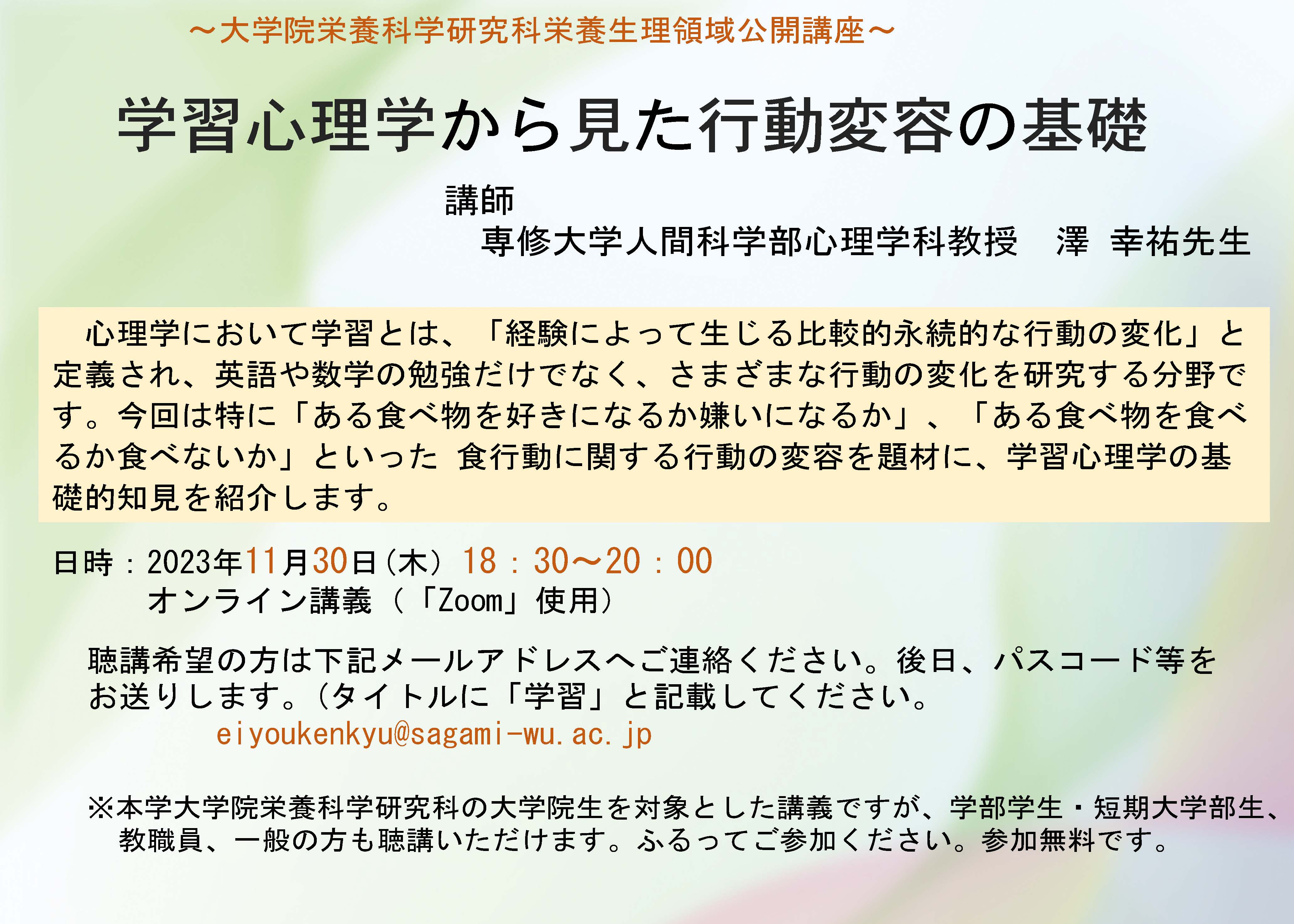 【栄養科学研究科】公開講座「学習心理学から見た行動変容の基礎」開講のお知らせ[11月30日・木曜日]