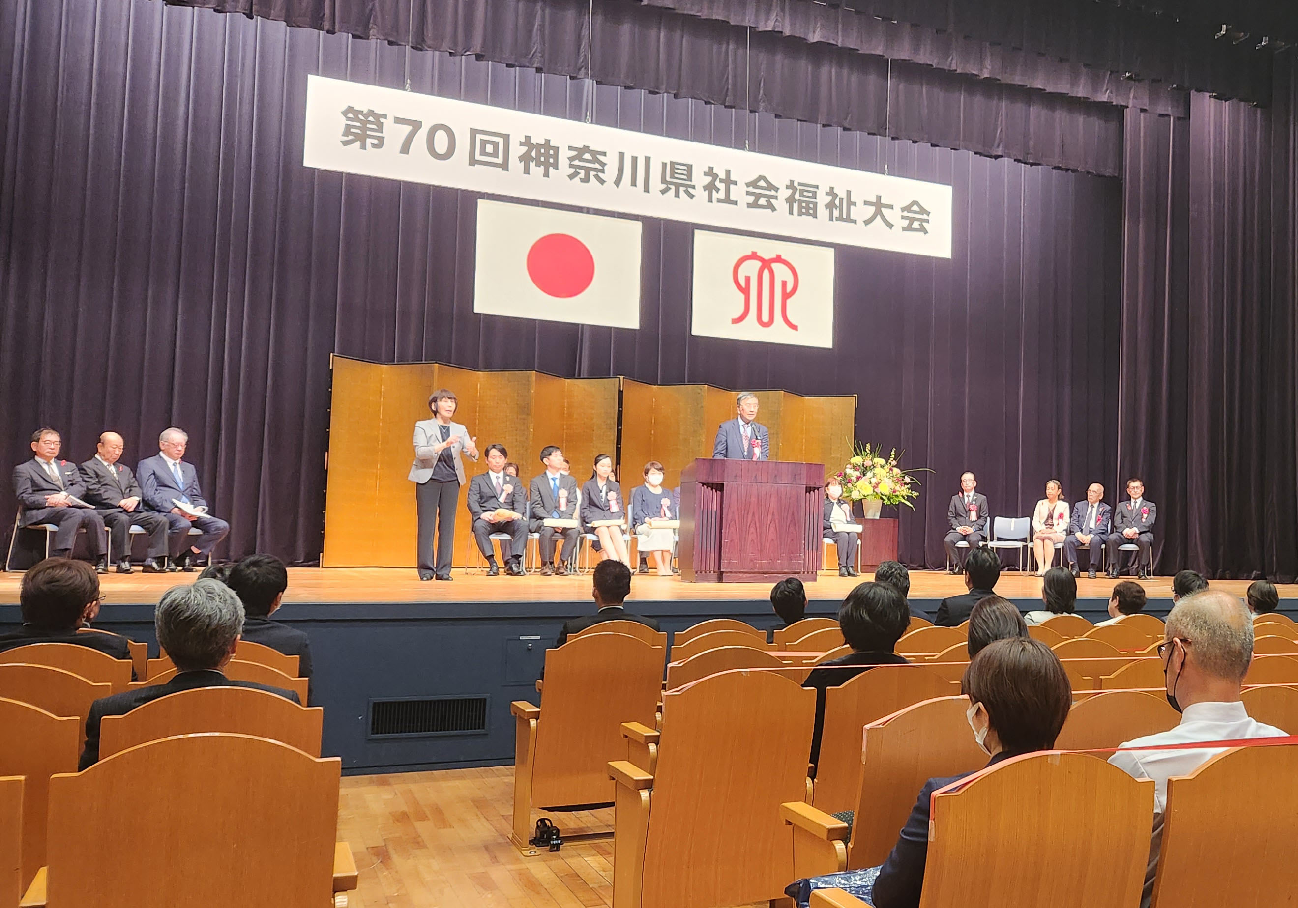 11月7日(火曜日)、第 70 回神奈川県社会福祉大会が行われました。この大会は、永年にわたり本県の社会福祉の発展に貢献し、功績のあった方々を称えるとともに、その活動と経験を継承し、「ともに生きる社会」づくりの一層の推進を図るために開催されています。