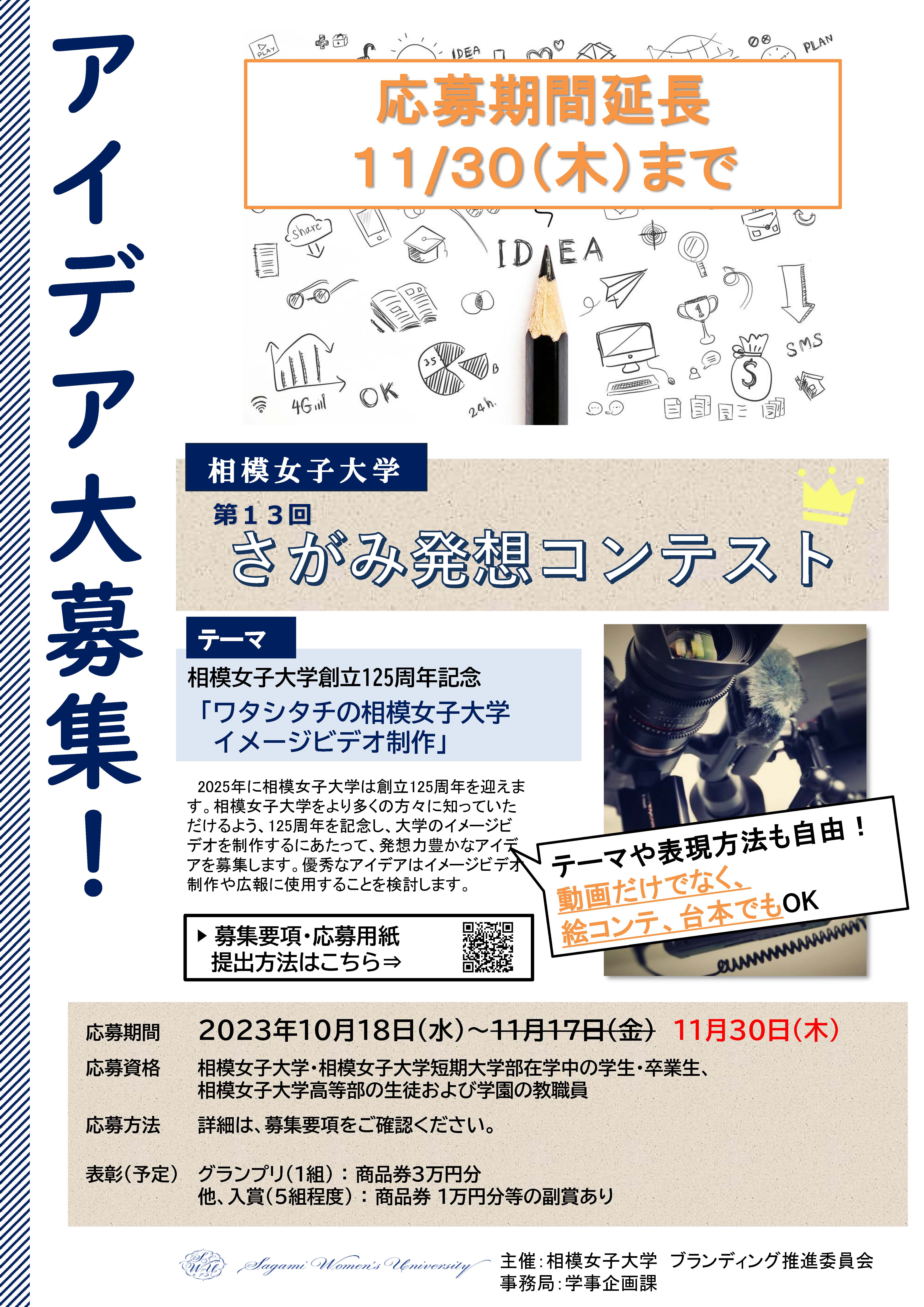 【応募期間延長】さがみ発想コンテスト「ワタシタチの相模女子大学 イメージビデオ制作」のアイデアを募集中(11月30日申込締切)