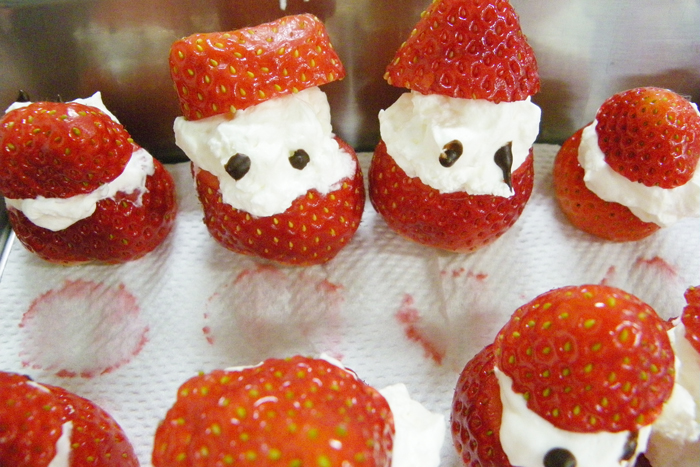学生たちはチョコペンでイチゴに目を書き、可愛いサンタクロースに見立てて『クリスマスロールケーキ』に添えました。