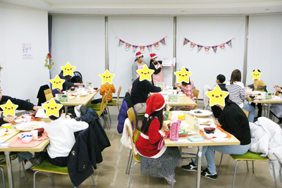 クリスマス近くの12月22日(金曜日)に、食物栄養学科の栄養指導ゼミナールの学生が、本年度第6回『ぴよにわ子ども食堂』を開催しました。今回も、たいへん多くのみなさまに参加希望をいただきました。抽選の結果35名(子ども18名)の方々に参加いただきました。