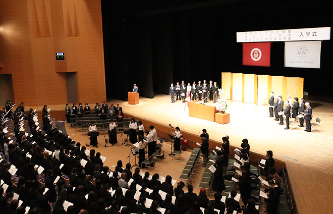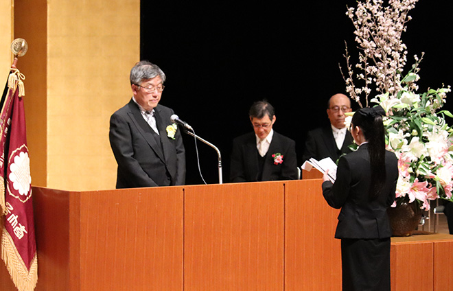 今年の入学式は、ご家族・保証人の列席のもとマンドリンクラブによるオープニングセレモニーの後、開式されました。田畑雅英学長より「新入生を迎えることば」、風間誠史理事長、同窓会翠葉の田中百子会長より「お祝いのことば」が述べられました。
