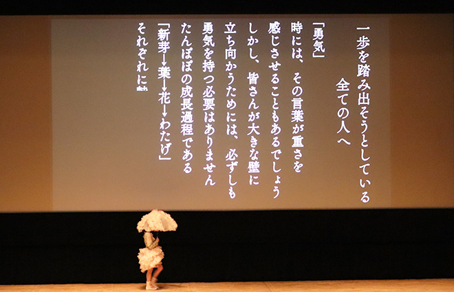 式典終了後には、新入生歓迎プログラムとして、アカデミックガウンの紹介が行われた後、夢をかなえるセンターの活動紹介、生活デザイン学科の学生による新生活をイメージしたファッションショー、さらにはアイドルダンスクラブ、舞踏研究部、ダンスクラブEASTERによるお祝いのパフォーマンスが行われました。