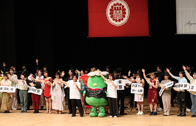 最後に吹奏楽部の演奏のもと、その他のクラブ学生が合唱を披露し、学園キャラクター「さがっぱ・ジョー」とともに会場を大いに盛り上げました。