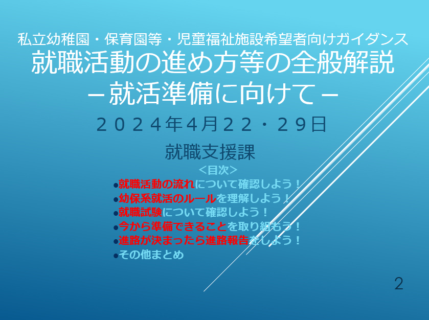 子ども教育学科のガイダンスは、4年生を対象に就職活動が本格化する前の4月頃に毎年実施しています。幼稚園教諭や保育士として、私立幼稚園・保育園・こども園・各種施設へ就職を希望する学生に、園の探し方や求人票の見方、園見学について具体的に説明しました。