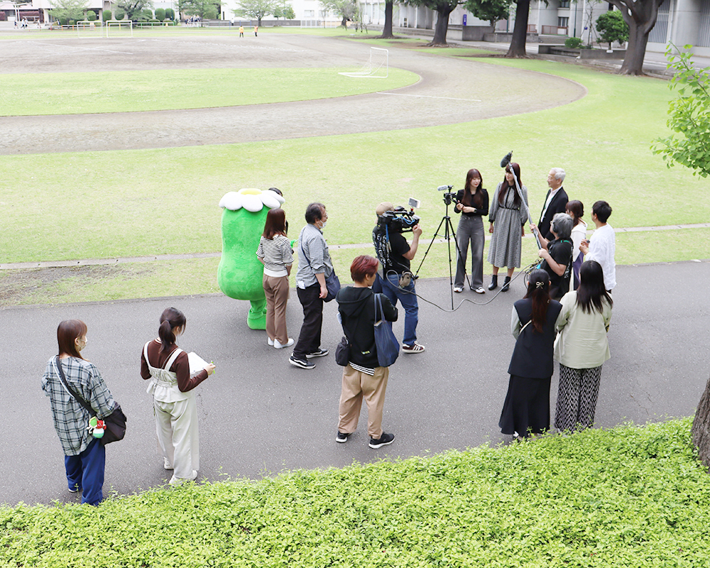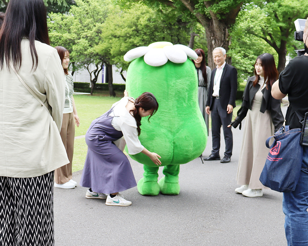 撮影をしていた人間社会学部社会マネジメント学科井坂聡教授とゼミナール生がインタビューに答えます。照井七瀬さんは、さがっぱ・ジョーのお尻に興味津々でした。