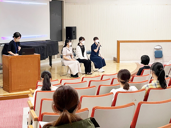 講演会では、「内定者インタビュー」として、同じ学科の4年生3名が登壇し、就職活動や学生生活、低学年のうちにやっておくべきことなどについてお話しをしてもらいました。また、就職支援課より、就職支援課で行っているサポートについて説明がありました。講演会に参加した学生は、熱心に話を聞き、質疑応答を通して、疑問や不安を解消する機会となりました。