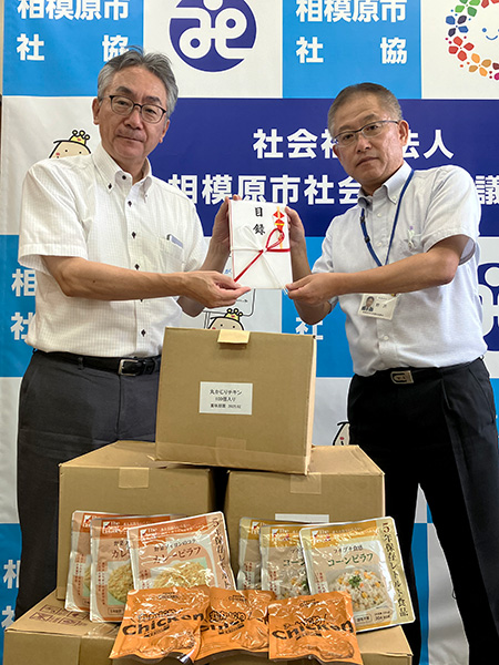 本学では大規模災害に備えて、学生・教職員に提供する防災備蓄品を保管し、一定期間毎に入れ替えを行っています。その時に賞味期限到来間近の食品を、地域の食育支援とフードロス削減に配慮した取り組みの一環として、昨年度より社会福祉法人相模原市社会福祉協議会に寄付を行っています。今年度も7月に続き、カレーピラフ、コーンピラフ及び丸かじりチキン各2,000食分を、相模原市内のこども食堂など食品を必要としている団体に食育支援等をしている同協議会に寄付をしました。