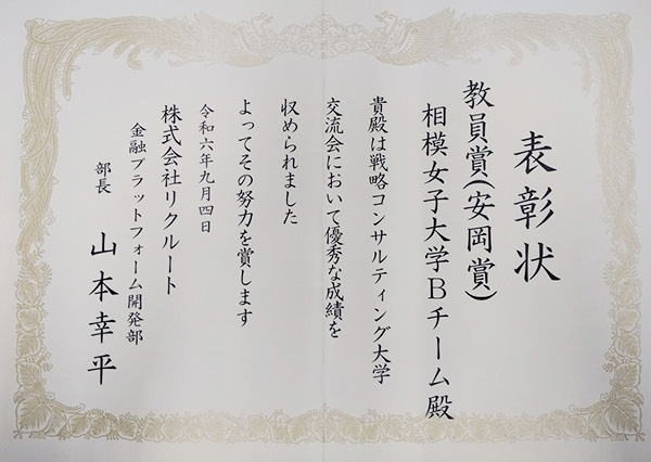 金森ゼミAチームは「スタディサプリのターゲット拡大」、Bチームは「ホットペッパーグルメの検索方法の改善」をテーマに共同研究し、交流会の場で発表しました。このうちBチームが教員賞を受賞し、株式会社リクルート様より表彰状が授与されました。