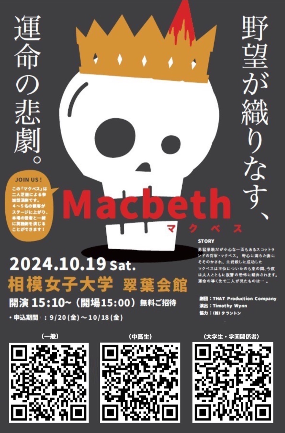 シェイクスピア『Macbeth』の舞台が、10月19日(土曜日)に本学で開催されます。