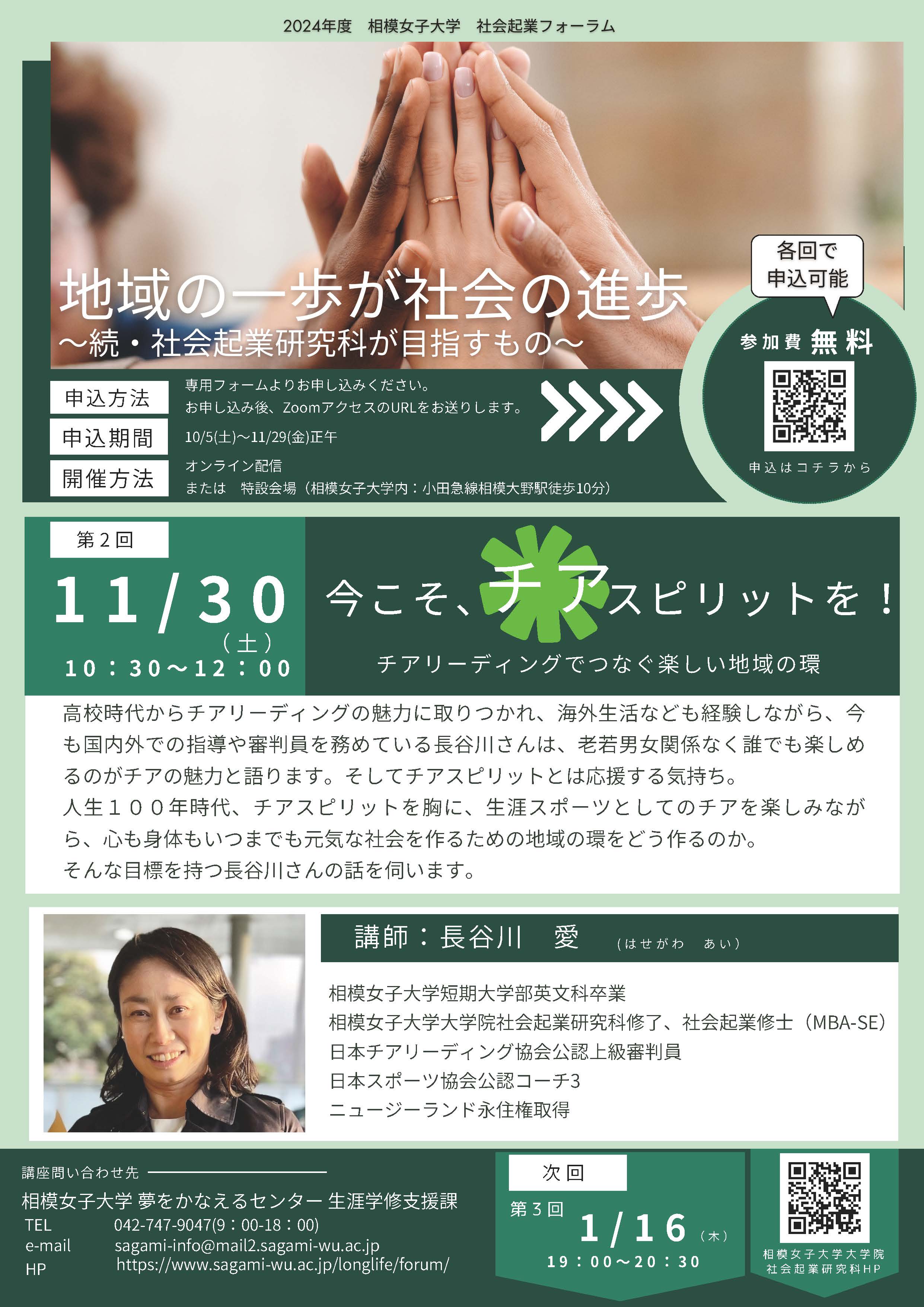 11月30日(土曜日)、 第2回 社会起業フォーラム『今こそ、チアスピリットを!チアリーディングでつなぐ楽しい地域の環』を開催します。