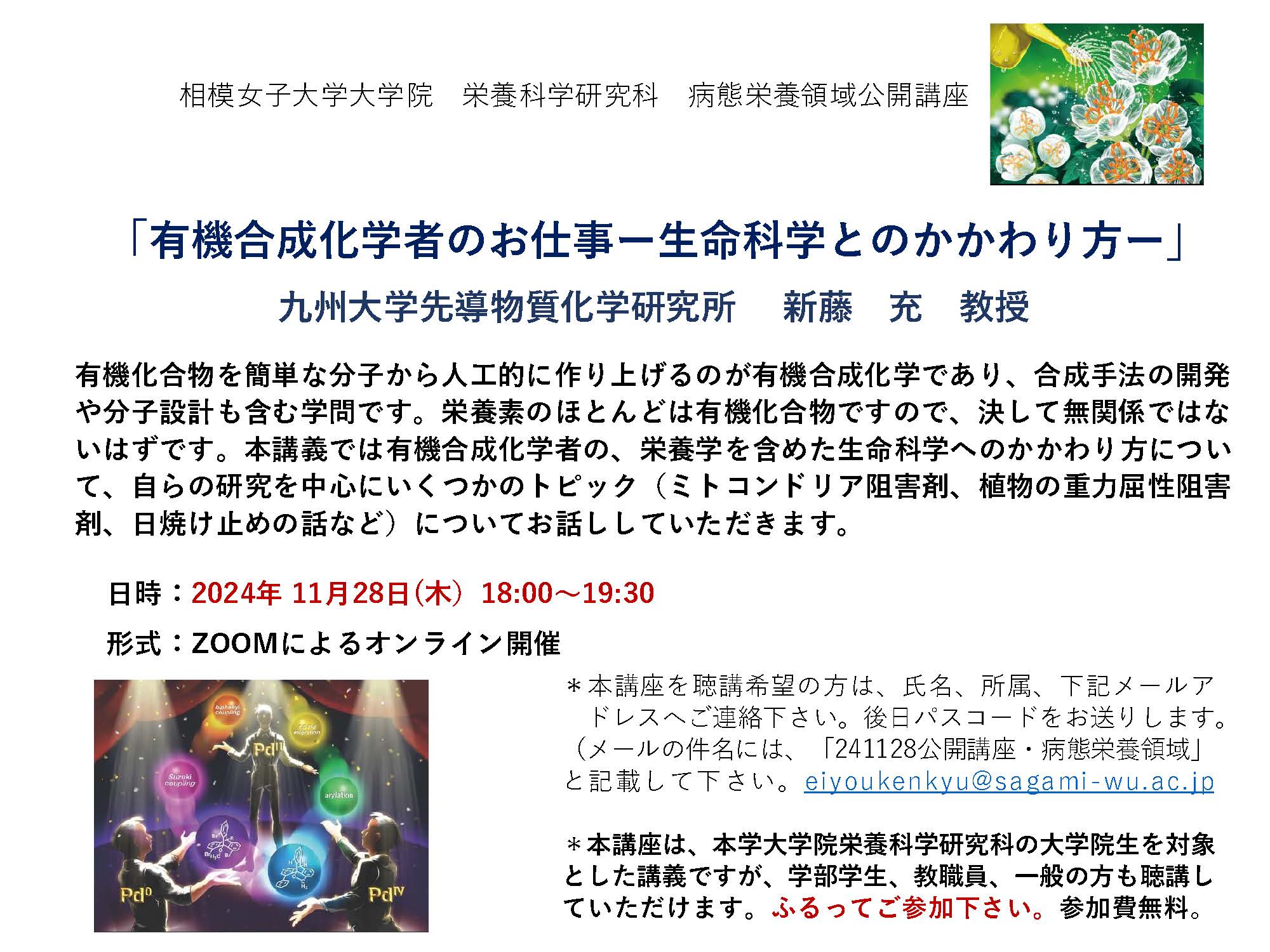 本講座を聴講希望の方は、氏名・所属を下記メールアドレスへご連絡ください。 eiyoukenkyu(アットマーク)sagami-wu.ac.jp 後日、パスコード等をお送りします。 *メールの件名には、「241128公開講座・病態栄養領域」と記載してください。 |