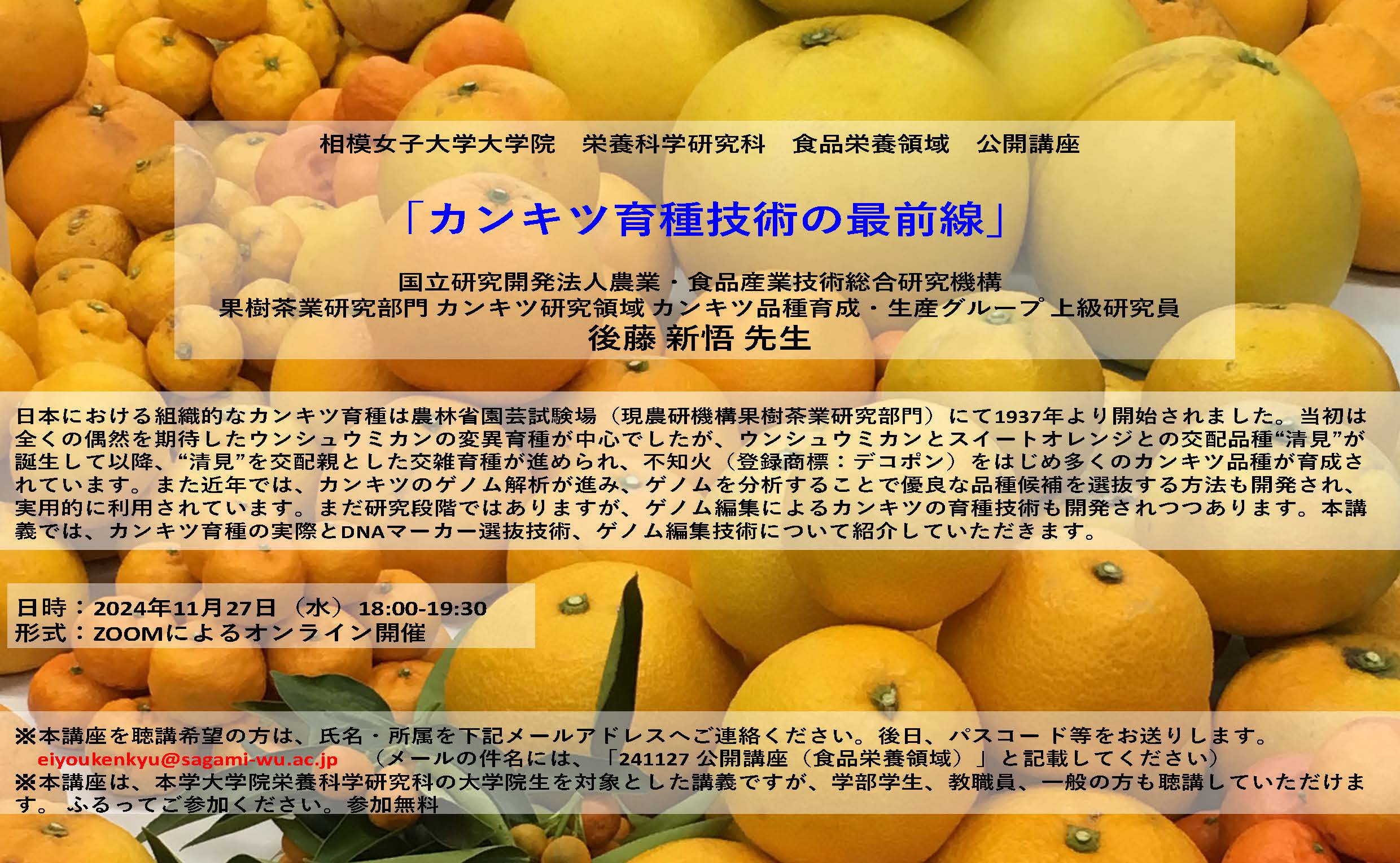 本講座を聴講希望の方は、氏名・所属を下記メールアドレスへご連絡ください。 eiyoukenkyu(アットマーク)sagami-wu.ac.jp 後日、パスコード等をお送りします。 *メールの件名には、「241127公開講座(食品栄養領域)」と記載してください。 |