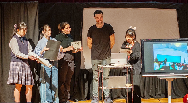 劇の運営にはメディア情報学科はYouTube配信や当日撮影班、子ども教育学科は事前学習から司会、英語文化コミュニケーション学科は企画・運営、中高等部生は事前準備から当日スタッフなど学園内の様々な方に携わっていただきました。