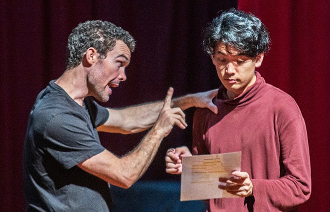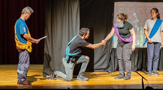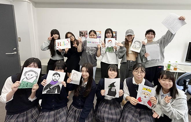 本番では、英語文化コミュニケーション学科中林教授をはじめ6名の生徒や学生も壇上に上がり演技に挑戦をしました。劇中の英語は古典英語ということや題材がシェイクスピア「マクベス」ということもあり難しさも感じましたが、文学に触れるきっかけとなりました。ワークショップでは実際に体を使い役者の2人とコミュニケーションを取る機会もありました。参加者からは「英語学習への意欲が高まった」「楽しかった」などの嬉しいお言葉もいただきました。学内学外問わず様々な方にご来場していただきとても嬉しかったです。