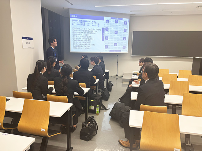 練習会では、様々な業種の企業の方々にご協力をいただき、本番さながらの集団面接・グループディスカッションを経験することができました。企業の方より、良い点・改善点のフィードバックが行われ、他校の学生からも刺激を受ける大変貴重な機会となりました。面接練習終了後には、各企業からの講評や質疑応答が行われ、座談会では、企業の採用担当者の説明を聞くことができました。参加した学生は「グループディスカッションの練習が出来て良かった」「自分を客観的にみることができた」と自信に繋がったようでした。