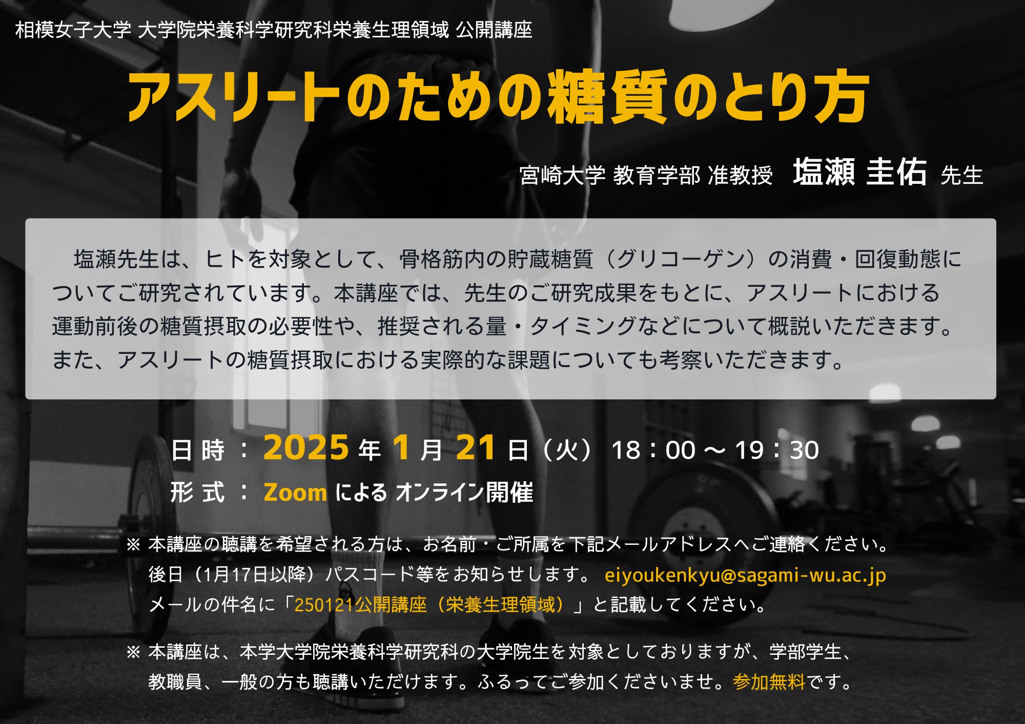 【栄養科学研究科】公開講座「アスリートのための糖質のとり方」開講のお知らせ[1月21日・火曜日]