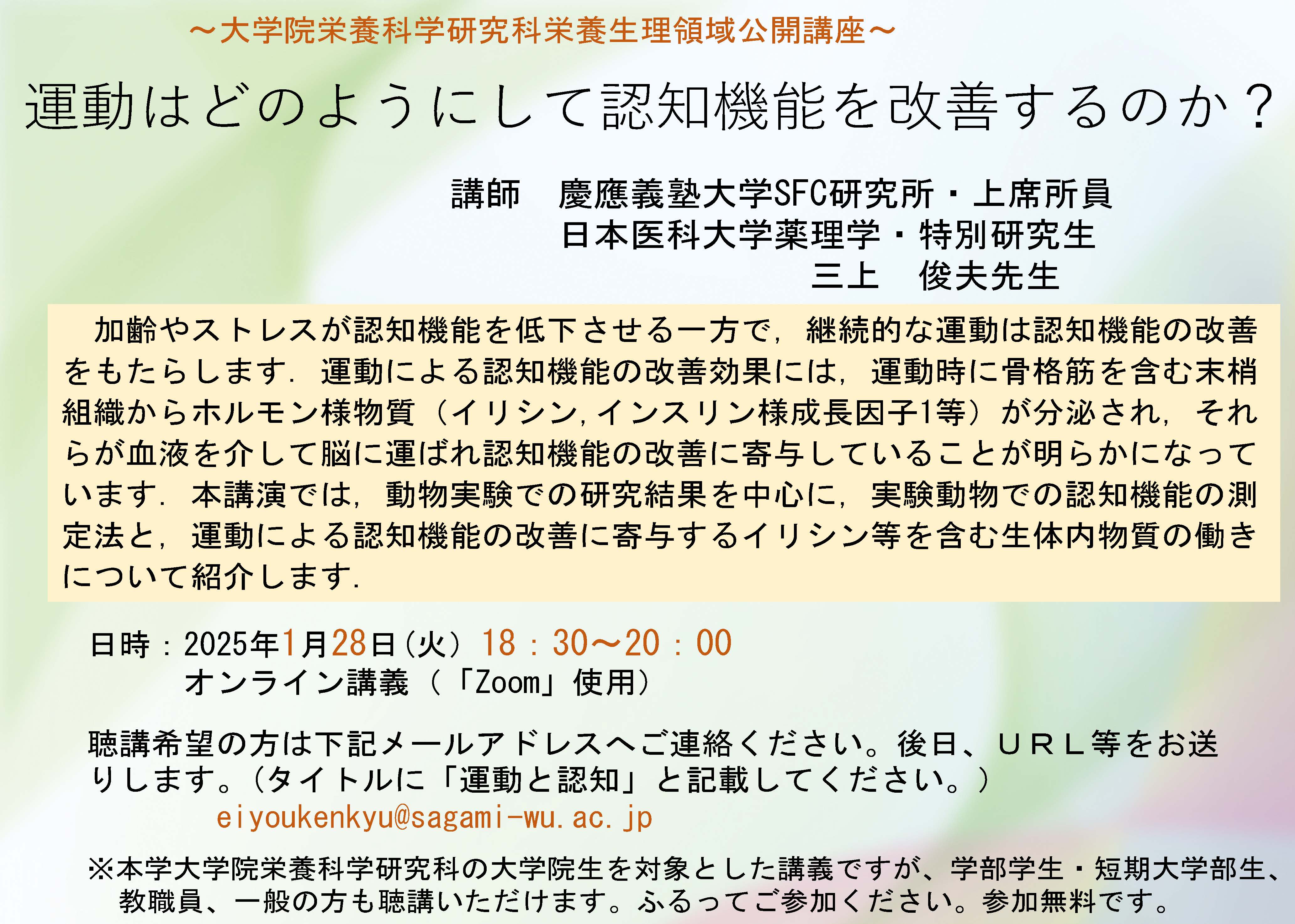 【栄養科学研究科】公開講座「運動はどのようにして認知機能を改善するのか?」開講のお知らせ[1月28日・火曜日]