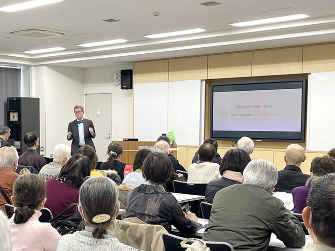1月11日(土曜日)に、ユニコムプラザさがみはらにて「オーサーズカフェ」が開催され、本学客員教授であるピーター・J・マクミラン客員研究員による講演「新年を寿ぐ和歌・俳句」が行われました。