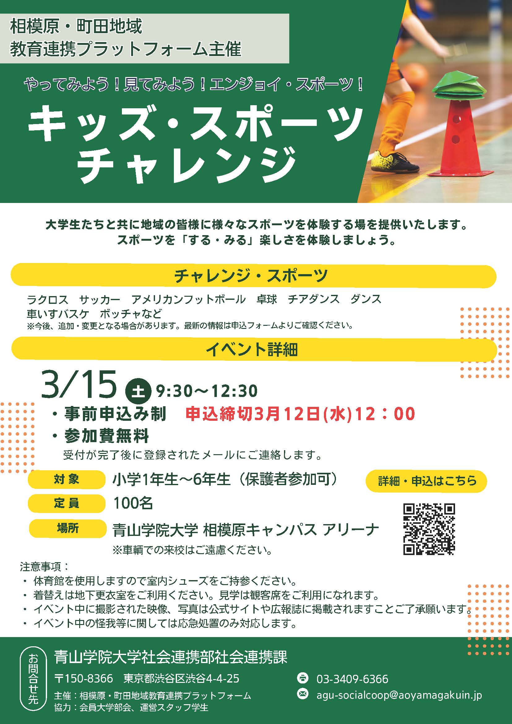 ホーム >  大学からのお知らせ >  相模原・町⽥地域教育連携プラットフォーム主催  スポーツチャレンジイベント「キッズ・スポーツチャレンジ」を開催します