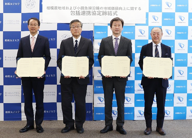 相模女子大学(神奈川県相模原市 学長:田畑 雅英)と小田急電鉄株式会社(本社:東京都新宿区 社長:鈴木 滋)、株式会社小田急SCディベロップメント(本社:東京都新宿区 社長:細谷 和一郎)、株式会社小田急エージェンシー(本社:東京都新宿区 社長:山口 淳)は、2025年2月19日(水)、同大学の創立125周年を契機と捉え、包括連携協定を締結しました。これは、相模原市をはじめ小田急線沿線の課題解決を通じて地域価値向上を目指すものです。
