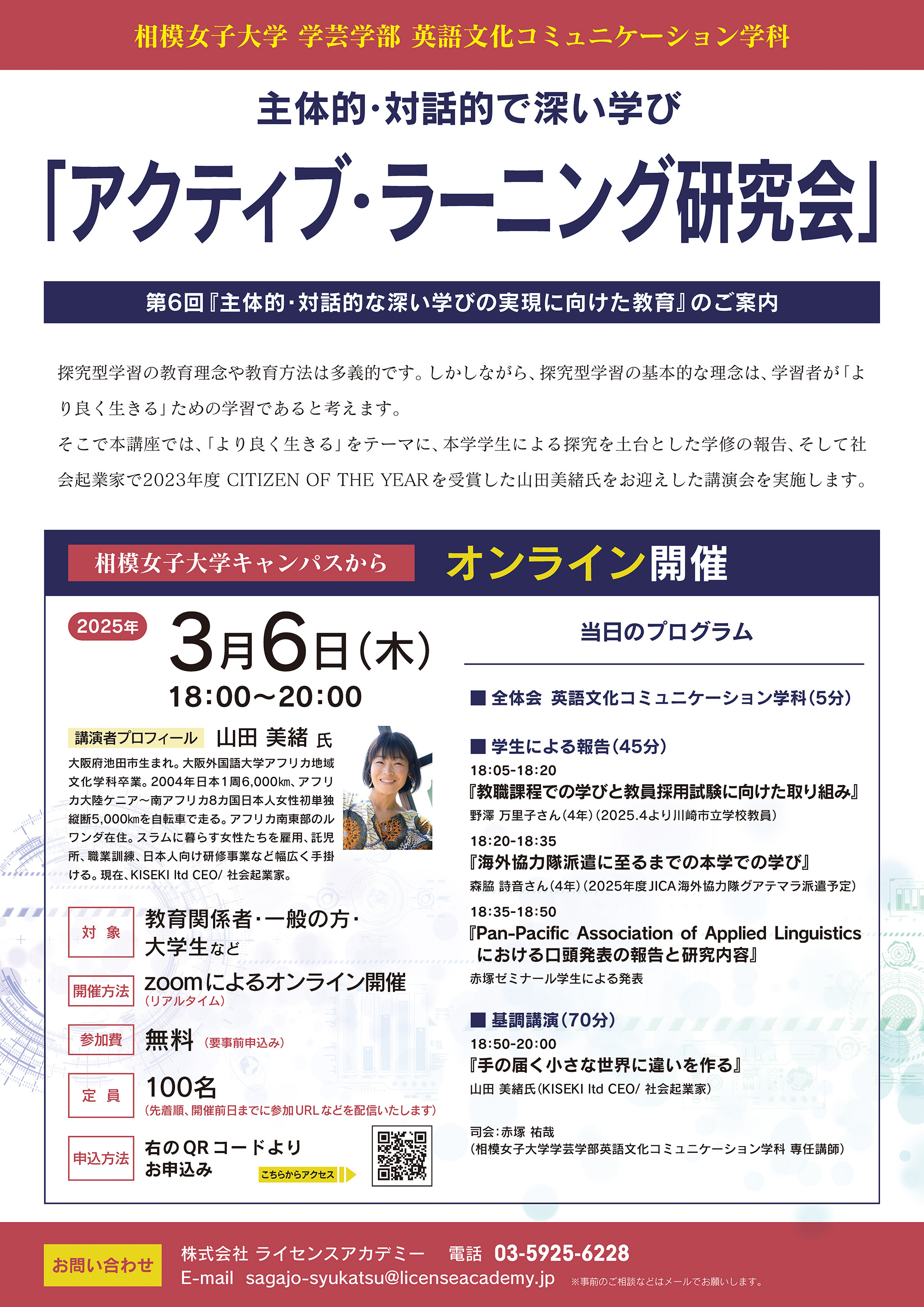ホーム >  大学からのお知らせ >  【英語文化コミュニケーション学科】「アクティブ・ラーニング研究会」第6回 『主体的・対話的な深い学びの実現に向けた教育』開催のお知らせ[3月6日・木曜日]